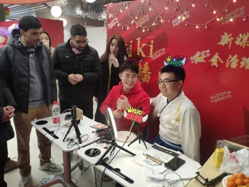 其间,结合当前移动互联时代热点的《Kiki直播间》活动受到同学们的积极参与,Kiki(王刚)及小助理(段永欣)模仿当下的网红风格,在展厅内利用抖音平台直播带货,“推销”口红、眼影、肉夹馍、汉服等各类物品,同时穿插了快闪“抖肩舞”等歌舞内容,引得现场笑声不断,使同学们体验了一把在互联网平台当“网红”直播的乐趣。