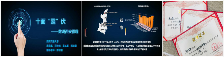 硕8087班周京乐、汪桂桢、吴丛堇、郭谊雷四名同学共同完成,在西安入选国家中心城市建设以及生态文明建设的社会背景下,分析考量西安雾霾形成的因素并提出具有针对性的合理化建议措施。四名同学表示,要想做出好的数据新闻,除了掌握精通技术工具和呈现方式,更要有对于现实环境的聚焦与关怀,才能实现新闻的价值与意义。